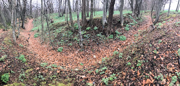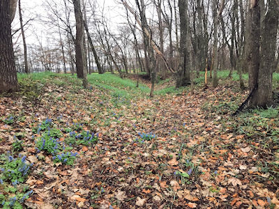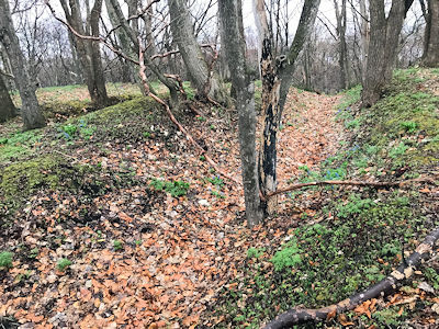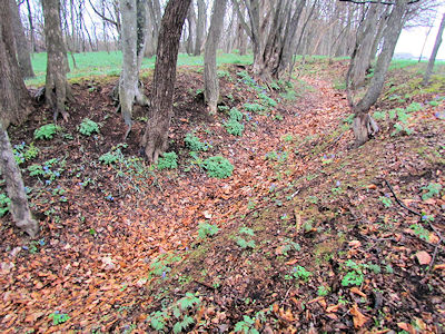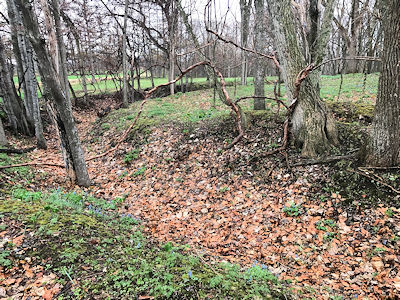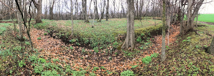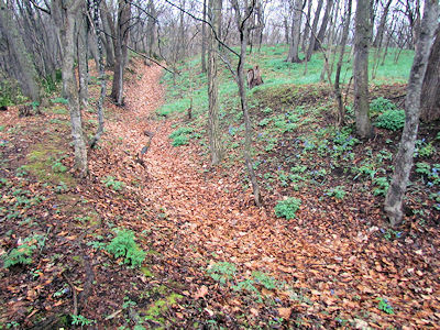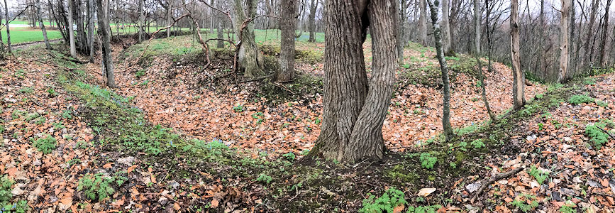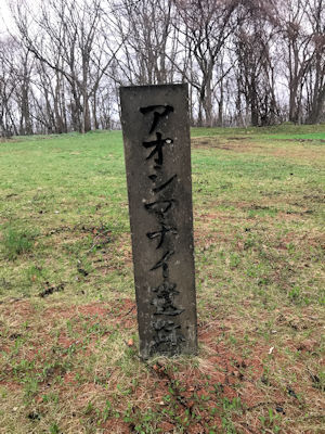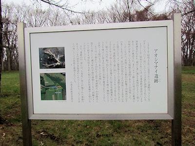 このアオシマナイチャシはアオシマナイ遺跡とも呼ばれ、縄文期からアイヌ期にかけての貝塚や住居跡なども出土しているそうです。チャシには2条の連結した半円状の壕が残っており、丁度「3」の字の形をしています。堀の幅は4〜8m、深さは1〜2mほどもあり、かなり大型のチャシです。