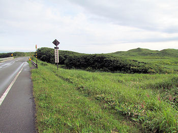 道北旅行の初日、天塩川口チャシのあと、道道106号線を北上しオネトマナイ川左岸チャシを目指しました。オネトマナイ川の手前で道路脇に若干の高まりがあったので、これがチャシであろうと思い写真を撮りました。このチャシに関しては「北の遺跡案内」に掲載されていたので場所はわかりましたが、形態や主な遺構など詳しい情報がないので、これいじょうのことはわかりません。ですが、いかにもチャシらしい立地だなあと思いました。