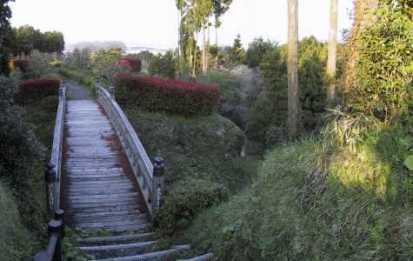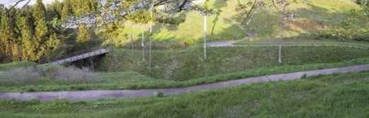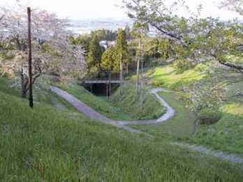 この頃にはだいぶん日も傾き、一日目の最後として松山町の千石城(松山城)を訪城しました。ここは現在、御本丸公園となっており、三の丸のすぐ下に駐車場があったので、そこに車を停めて歩いてみました。三の丸へ登る道を歩いていると、左側の下の方に堀切らしき物が見えました。さらに先に進み三の丸の左側の方に進むと、右側に三の丸と二の丸を仕切る堀切がありました。そこから二の丸に上がりさらに進むと、二の丸と本丸を仕切る堀切がまたあり、そこに架かっている橋を渡るといよいよ本丸です(といっても何もないんですけど(^^;))